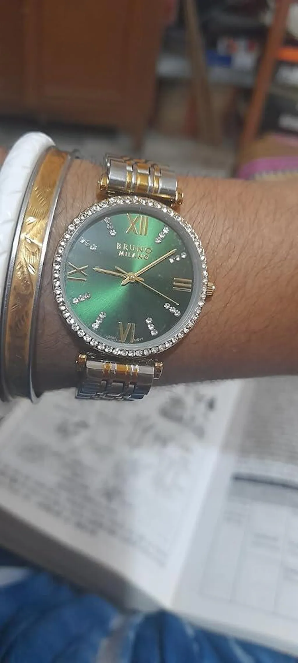 Introducing the epitome of elegance and luxury - the Women's Diamond-Studded Watch with a Stunning Green Dial. This exquisite timepiece is designed to captivate and mesmerize, making it the perfect accessory for the sophisticated woman who appreciates the finer things in life.