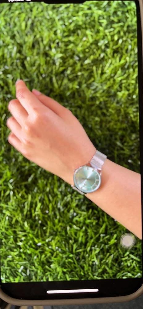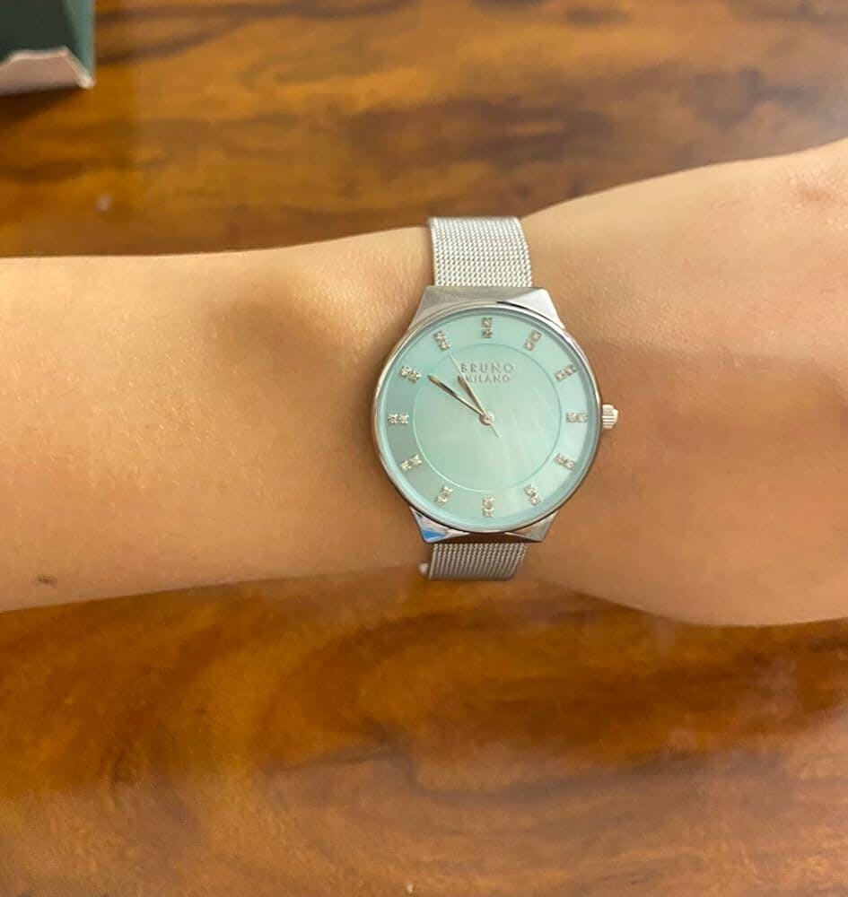 The serene light blue dial, adorned with shimmering diamond markers, exudes grace and femininity, while the silver accents add a touch of understated luxury to the design. The slim silhouette of the watch is complemented by the sleek stainless steel Milanese mesh band, creating a look that is both chic and versatile.